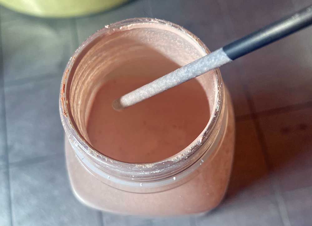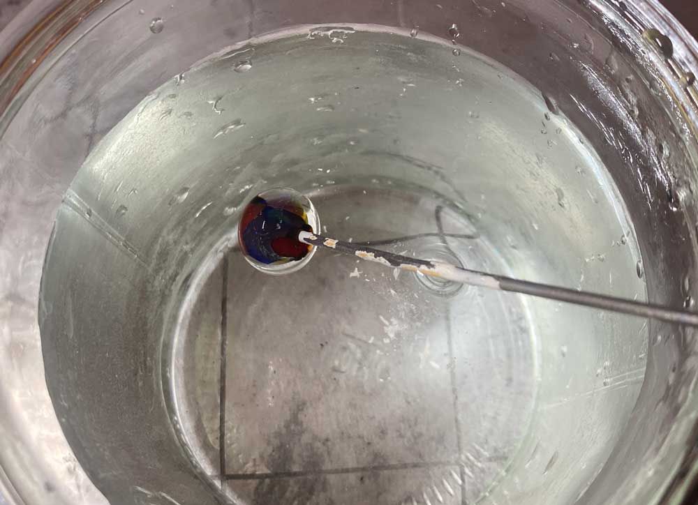 Nachdem die Glasperle abgekühlt ist, wird diese mit dem Metalldorn ins Wasser gelegt. So löst sich das Trennmittel und die Perle kann vom Dorn entfernt werden. Jetzt muss das Innenleben der Perle nur noch von den Rückständen des Trennmittels gereinigt werden.